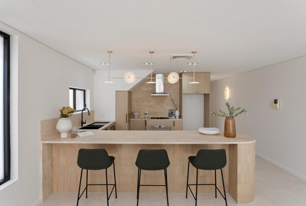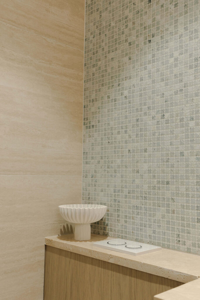 The kitchen is both sculptural and functional – a statement in travertine and texture. The island features our Zellige Taupe and Alhambra Travertine Mosaic connecting beautifully with the 30mm travertine benchtops, reflecting light and craftsmanship in equal measure.