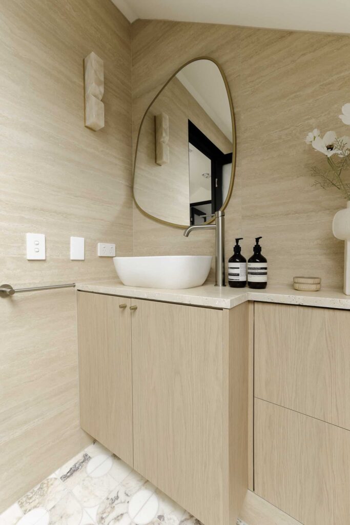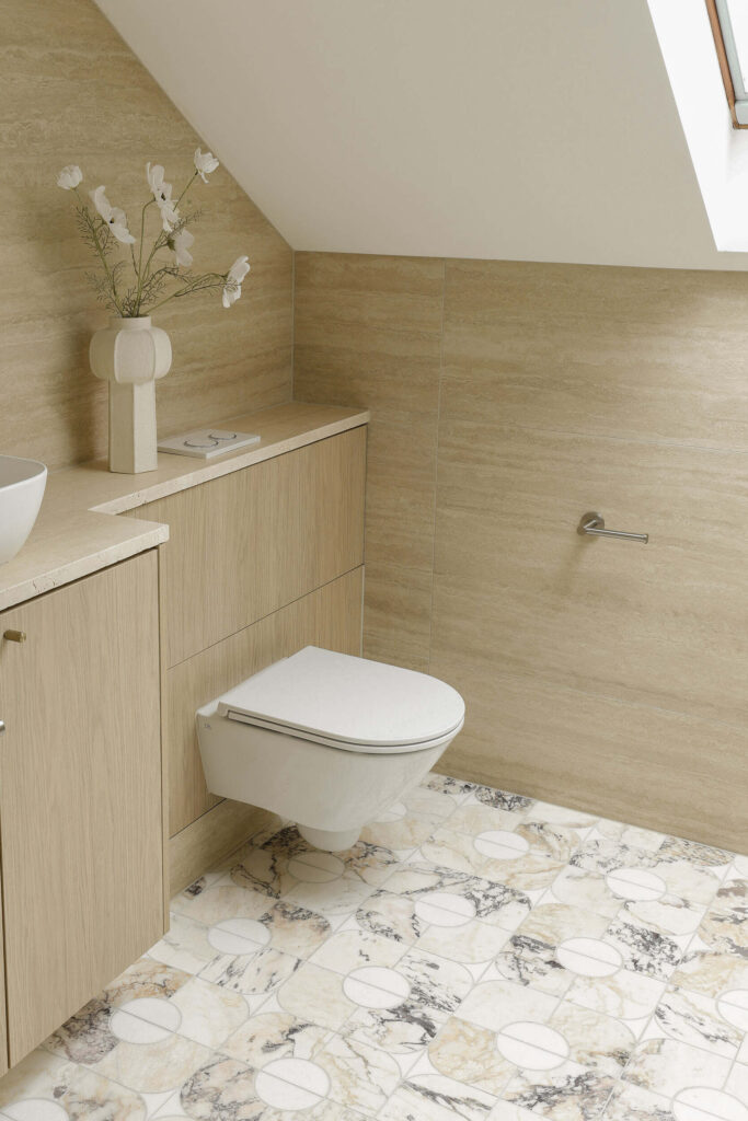 • Upstairs Bathroom: Designed with Viola Stella Cupola Marble Mosaic on the floor  and the Tufa Vein-Cut Ivory on the walls, complemented by brushed nickel ABI tapware, creating a timeless, elevated aesthetic.