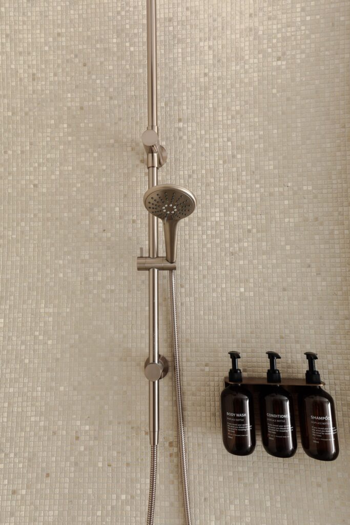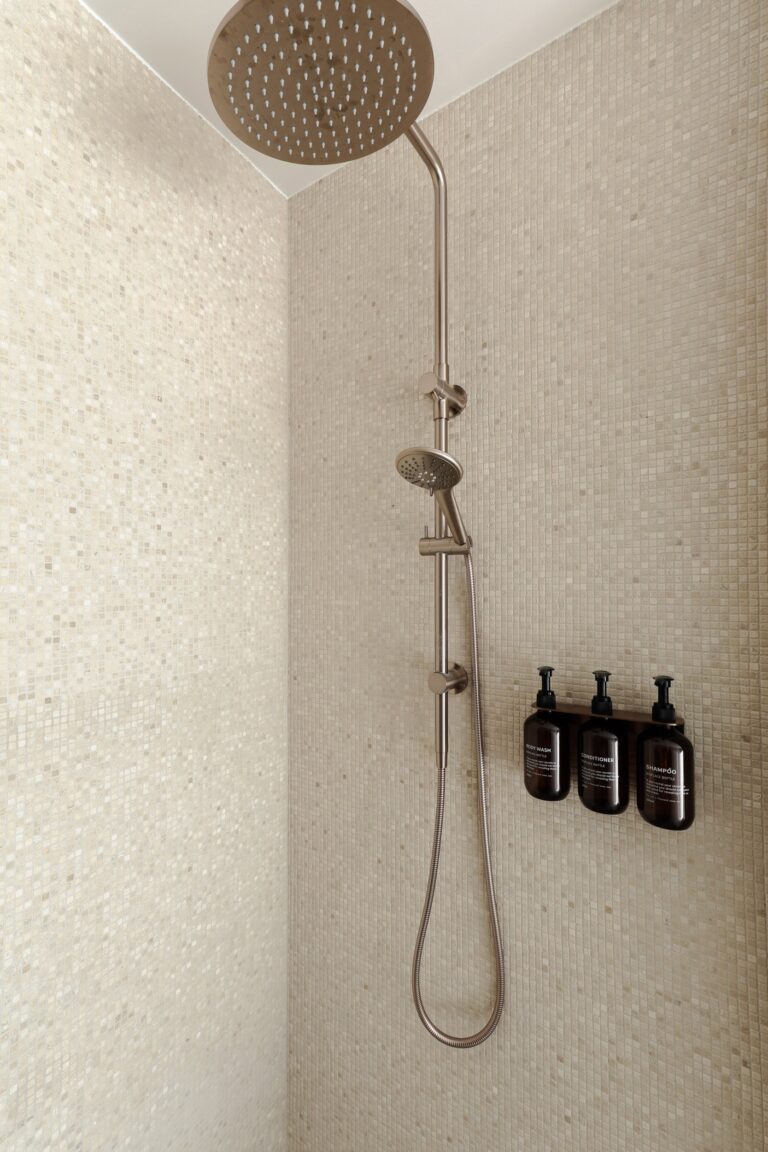 The ensuite blends Travertine Soft Stone with a Botticino Square 100 × 100 mm shower feature wall. This subtle interplay of tone and texture creates a spa-like atmosphere – a private retreat where tranquility and luxury meet.