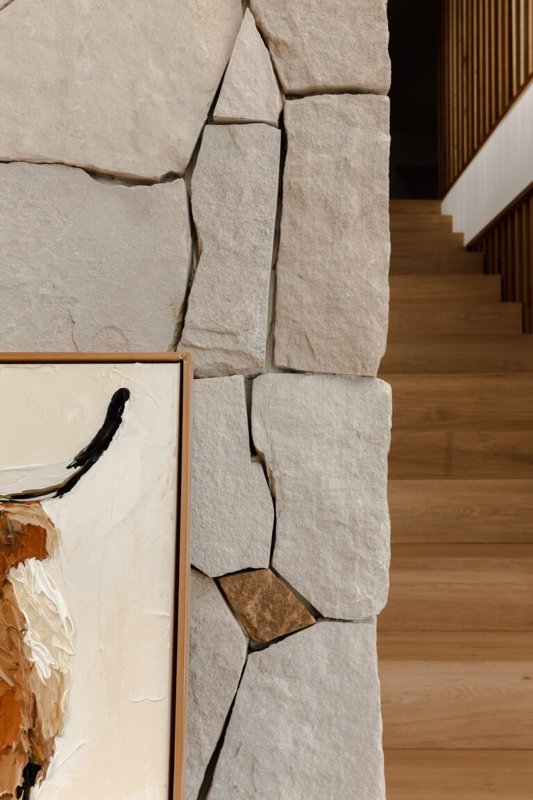 The journey begins at the front door, where CZ Wollombi Sandstone Random cladding forms a striking natural wall. Its rugged texture and earthy tones create a sense of permanence and welcome — a tranquil first impression that flows into the rest of the home.