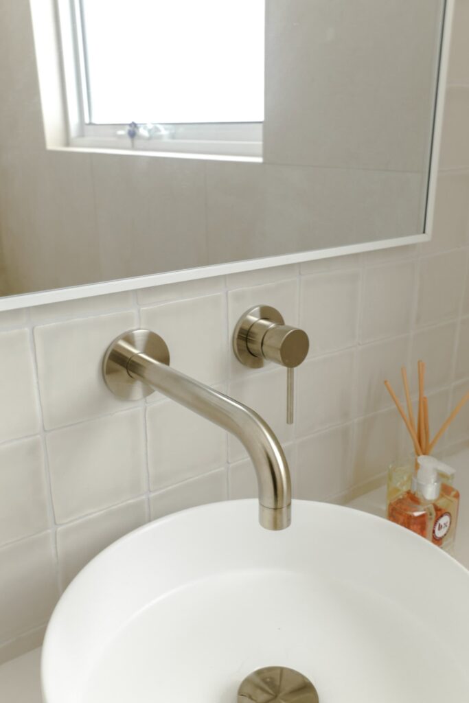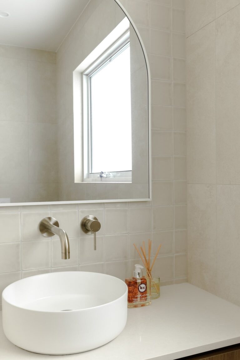 The downstairs guest bathroom welcomes visitors with comfort and elegance. Builders Range Travertino Bianco tiles paired with mini square mosaics create depth and softness, while the sculptural Nood Co Mill Basin (Mushroom) adds a tactile, organic element. The result is a space where guests feel cared for and at ease.