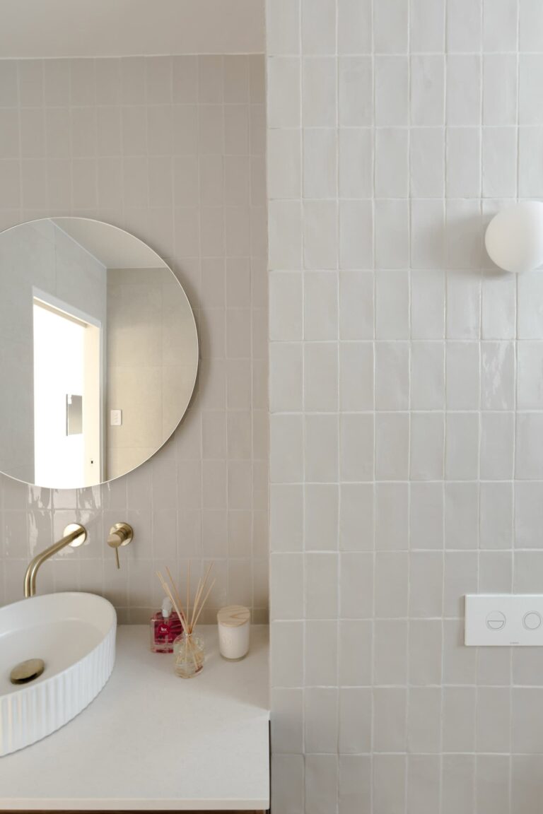 The space combines Manual Ash Subway 75 × 150 mm, stacked vertically, with the warmth of Travertine Soft Stone. The subtle contrast between glossy subway tiles and matte stone creates a playful yet serene retreat — a bathroom designed to feel calming and uplifting.
