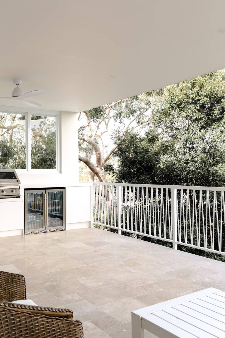 The balcony, BBQ area, and pool were designed as a retreat for entertaining and relaxation. Travertine French Pattern (12 mm) tiles provide a softly textured surface underfoot, complemented by Travertine Bullnose 406 × 610 mm around the pool edges. Together, they bring a sense of balance and continuity between indoor and outdoor living.