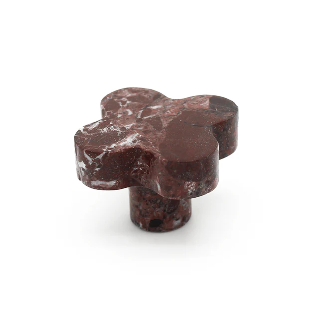 Introduce sculptural elegance and deep, rich tonality with our Stone Knobs. Expertly carved from solid marble, this playful yet refined clover silhouette adds character and luxury to any space. The stone’s dramatic burgundy base, paired with striking white veining, creates a bold visual moment across kitchens, bathrooms, wardrobes, or furniture accents.