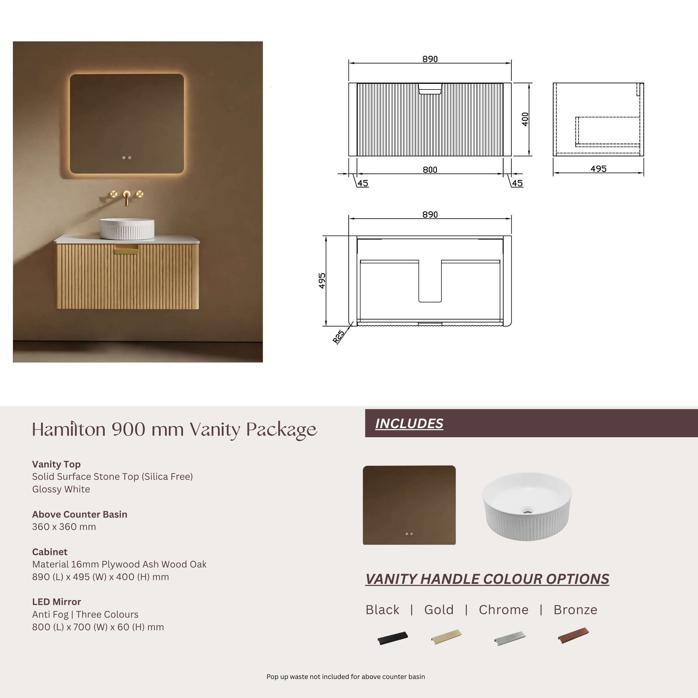 Hamilton Modern Wall Hung Vanity Mirror Basin Package 900 mm