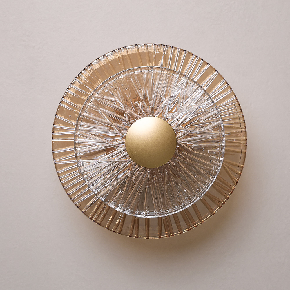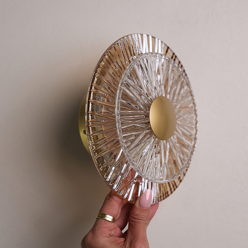 Elevate your space with the refined glow of our Nonna Wall Light. Designed with a sleek circular silhouette and layered amber and clear glass, Nonna casts a soft, warm illumination that enhances bathrooms, hallways and bedrooms with effortless sophistication. The matte brass gold finish adds a timeless, European-inspired touch, creating a subtle statement while maintaining a sense of warmth and elegance.